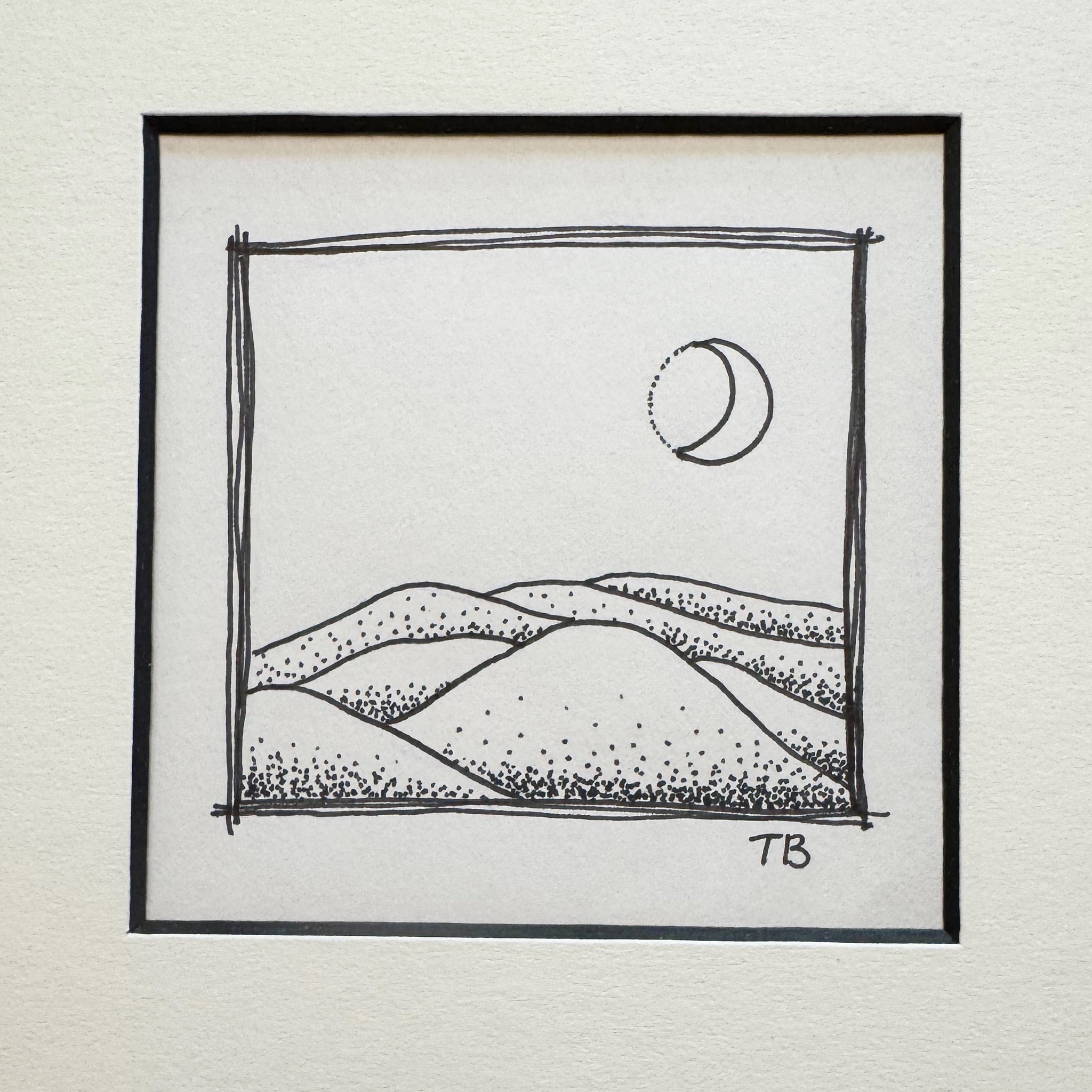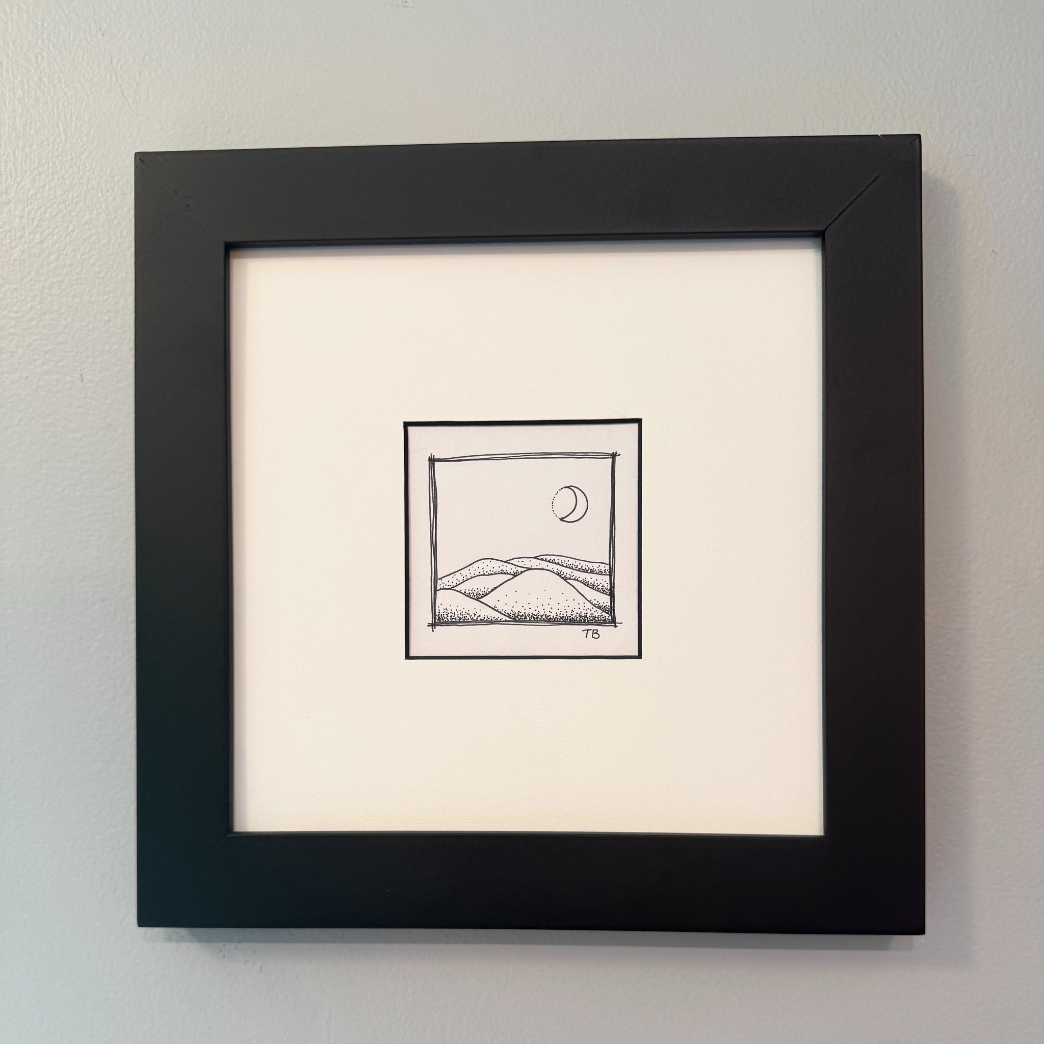 Ink on paper, matted, framed and ready to hang. Drawing size is approx. 3" w x 3" h. Framed size is 8 w" x 8" h.